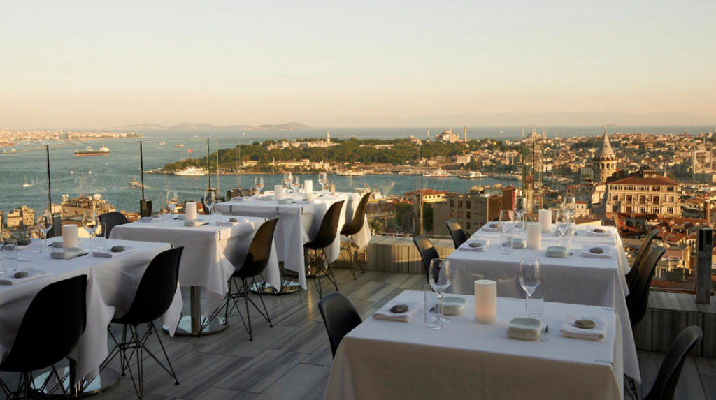 يقع على سطح فندق مرمرة ، مناظر سامية على اسطنبول تشمل آيا صوفيا وقصر توبكابي. مع الأثاث الرئع والبار المصنوعة من العلاقات للسكك الحديدية الخشبية، تعكس قائمة الطعام الفريدة من نوعها الخلفية التركية الاسكندنافية للشيف المالك محمد غورس، الذي كان رائدا في مشهد المطعم المعاصر في اسطنبول. غورس ببراعة يدمج تقنيات الطبخ الاسكندنافية مع التركية، والنتيجة وجبات شهية مثل الهامور الخام مع الزيتون والليمون، وقهوة فانيلا التركية. بار تراس السطح في مرمرا ,كما يمكنك مشاهدة مجموعة الشمس في هذه المدينة التاريخية.